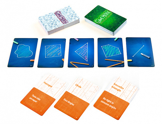 The object of the whole game as well as each separate move is to collect as many cards as possible. There are cards with geometric figures and cards with various figure attributes (for example “Two acute angles” or “Not all sides are equal”). Five Figure cards are laid out on the playing field. During his turn, a player starts taking Attribute cards one by one from the deck. He can continue to take the Attribute cards as long as they describe at least one of the Figure cards laid out on the table. The more cards the player collects, the harder it will be to match the attributes to figures, but the chances of winning are also greater.