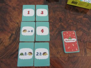 Hurricount war das erste Spiel, das mir gezeigt wurde auf der Messe. Und wir haben es zusammen gespielt. Ich dachte immer, ich bin schnell in solchen Aufgaben, aber der Herr am Stand, wie ich später erfahren habe, der Designer, war deutlich schneller. Also auch ein tolles Duell unter Erwachsenen, ähnlich fordernd wie SET!, falls das jemand kennt. Ich habe im kleinen Zahlenbereich, und durch aussortieren einiger Karten das Spiel mit dem Knopf ausprobiert, und es klappt tatsächlich inzwischen ganz gut. Er hatte jedenfalls Spaß an der kleinen Kopfrechenübung. Das Material und die Illustrationen sind auch toll gestaltet.