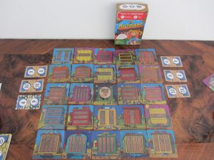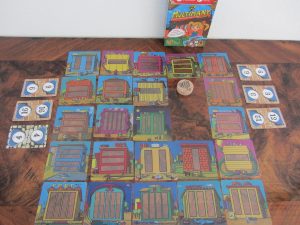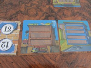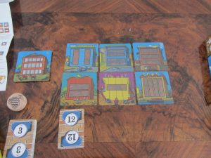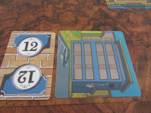 Jetzt geht es auf die Baustelle. Das erste Spiel aus dieser Box ist eine „Ich hab’s“-Variante. Es werden sechs transparente Häuserkarten ausgelegt. Diese Karten haben 1-5 Fenster, und werden diese orthogonal versetzt aufeinander gelegt, kann man dadurch das Produkt der Fenster abzählen. 3 Fenster mal 4 Fenster sind eben 12 kleine Fenster.
